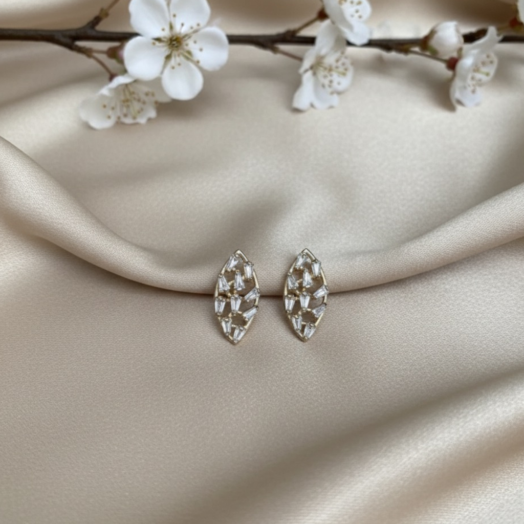 O brinco folheado a prata com zircônias baguete traz um design elegante em formato de folha, ideal para compor looks refinados com um toque moderno. Suas pedras alongadas oferecem um brilho único e sofisticado, perfeito para quem busca um acessório leve, mas com presença.