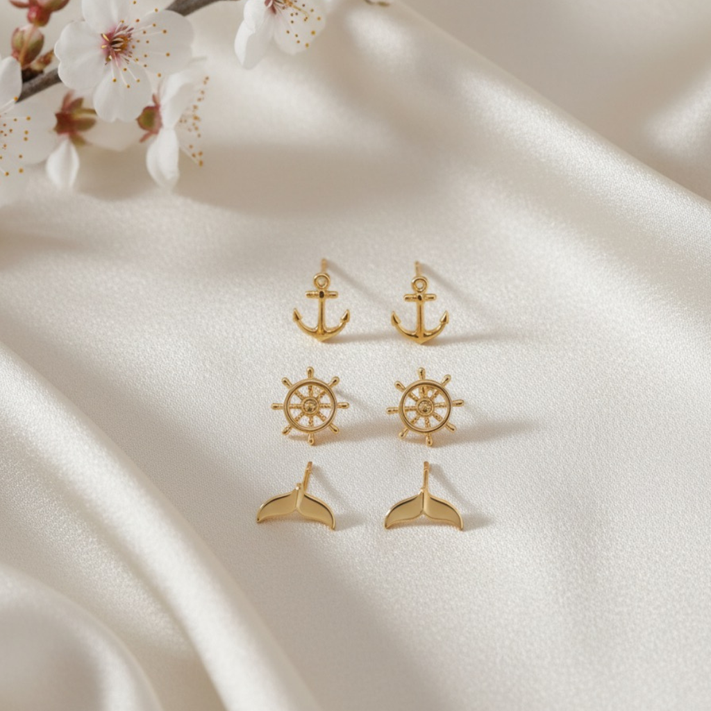 Para quem ama o estilo do mar e quer levar um toque náutico para o look! Esse trio de brincos dourados combina símbolos clássicos da vida marítima com um design delicado e moderno.