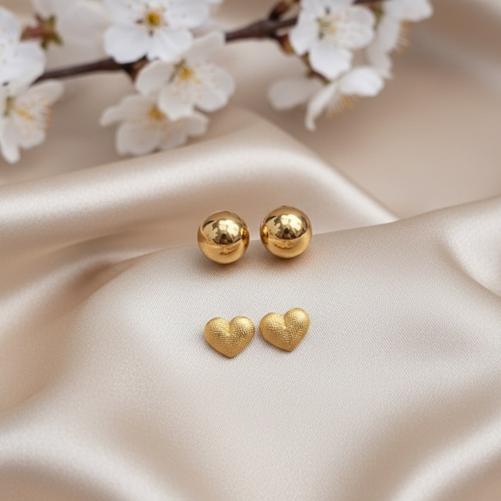 Esse duo de brincos femininos dourados é perfeito para quem busca versatilidade e charme em acessórios delicados. O primeiro modelo é o clássico brinco de bolinha dourada, ideal para o dia a dia, combina com qualquer look e nunca sai de moda. Já o segundo modelo traz um toque romântico com brinco em formato de coração texturizado, moderno e delicado ao mesmo tempo, perfeito para composições mais afetivas e cheias de estilo.