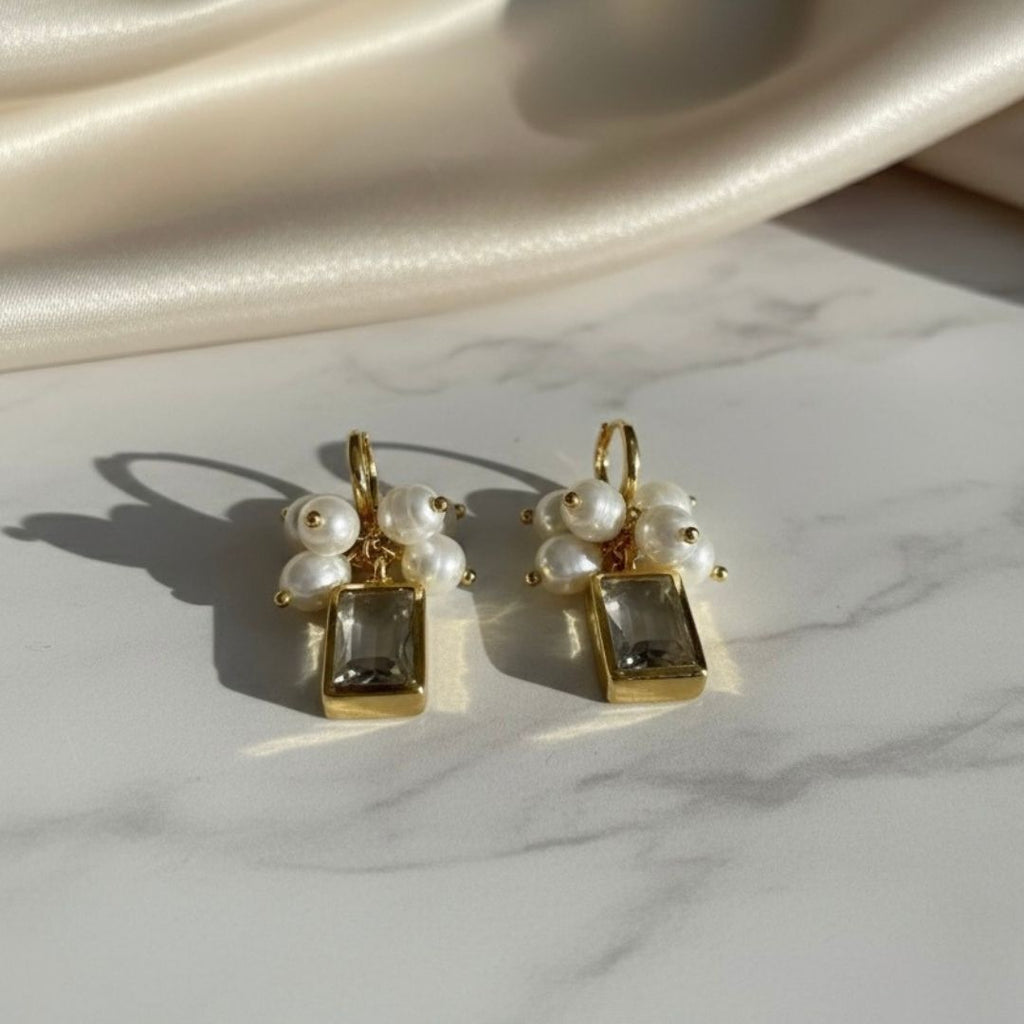 Elegância e brilho em uma peça única: o Brinco Dourado com Pérolas e Pedra Retangular em Cristal, feito com banho de ouro, é a combinação perfeita entre delicadeza e sofisticação. O cluster de pérolas traz leveza e feminilidade, enquanto a pedra lapidada retangular adiciona um toque de luxo moderno, criando um visual equilibrado e extremamente marcante.