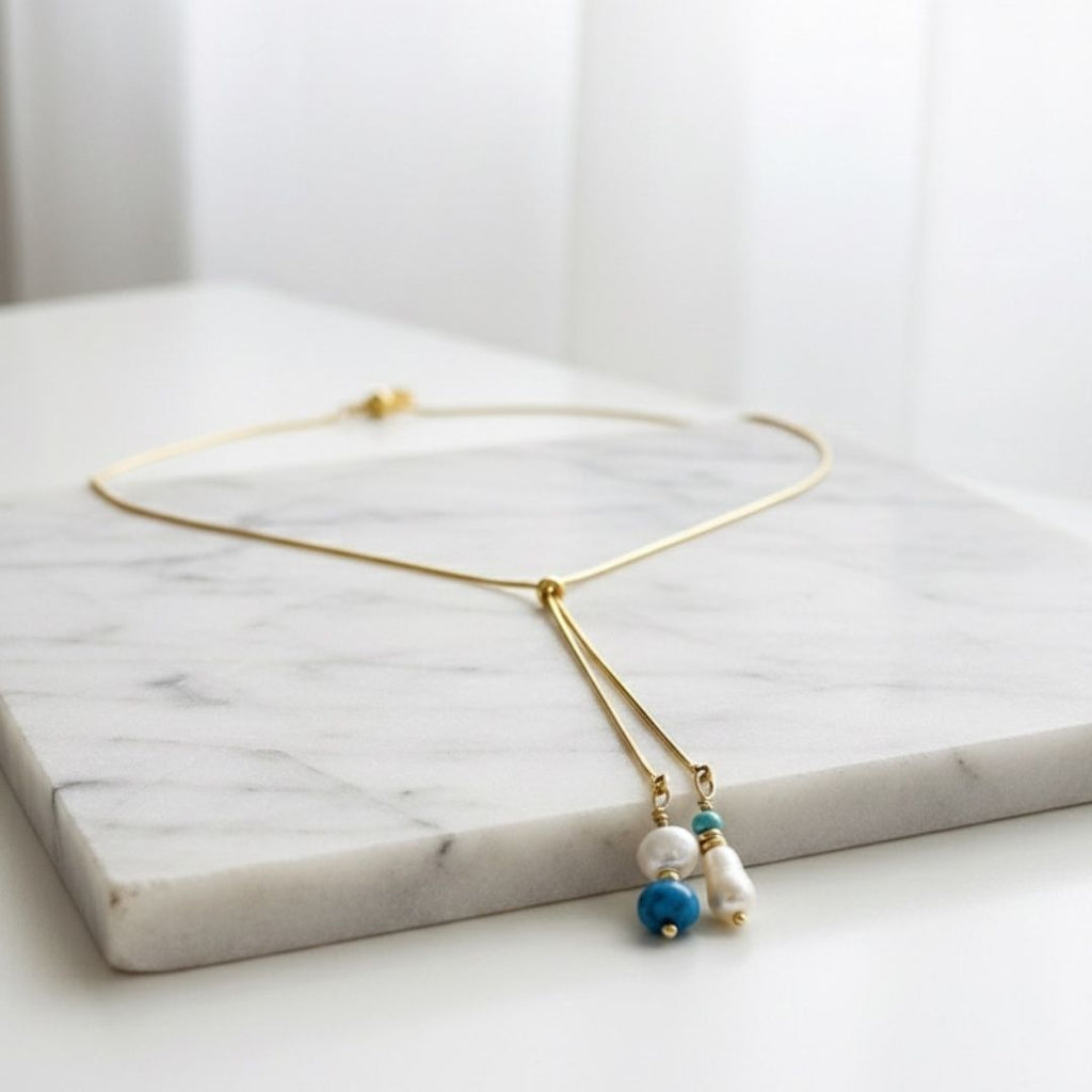 As pérolas naturais trazem brilho orgânico e delicadeza, enquanto a pedra azul adiciona profundidade e cor, criando um contraste elegante e marcante. Uma peça versátil e estilosa, ideal para elevar qualquer produção — do básico refinado ao look mais sofisticado.