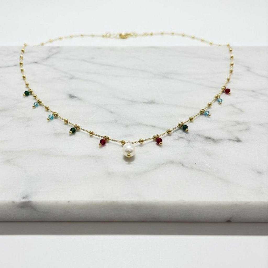 Delicado, moderno e cheio de charme: o Colar Dourado com Cristais Coloridos e Pérola Central, com banho de ouro, é aquela peça que ilumina qualquer produção com um toque leve e sofisticado. Os cristais em tons de azul, verde e vermelho trazem um brilho sutil e alegre, enquanto a pérola central adiciona um toque clássico e elegante ao design.